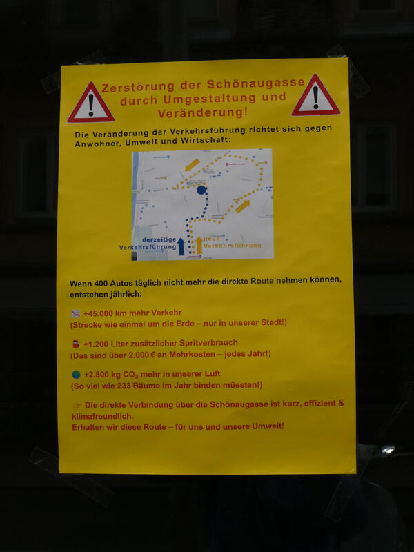 Destruction of Schönaugasse through remodeling and change! The change of the traffic direction is directed against the residents, the environment, and the economy.