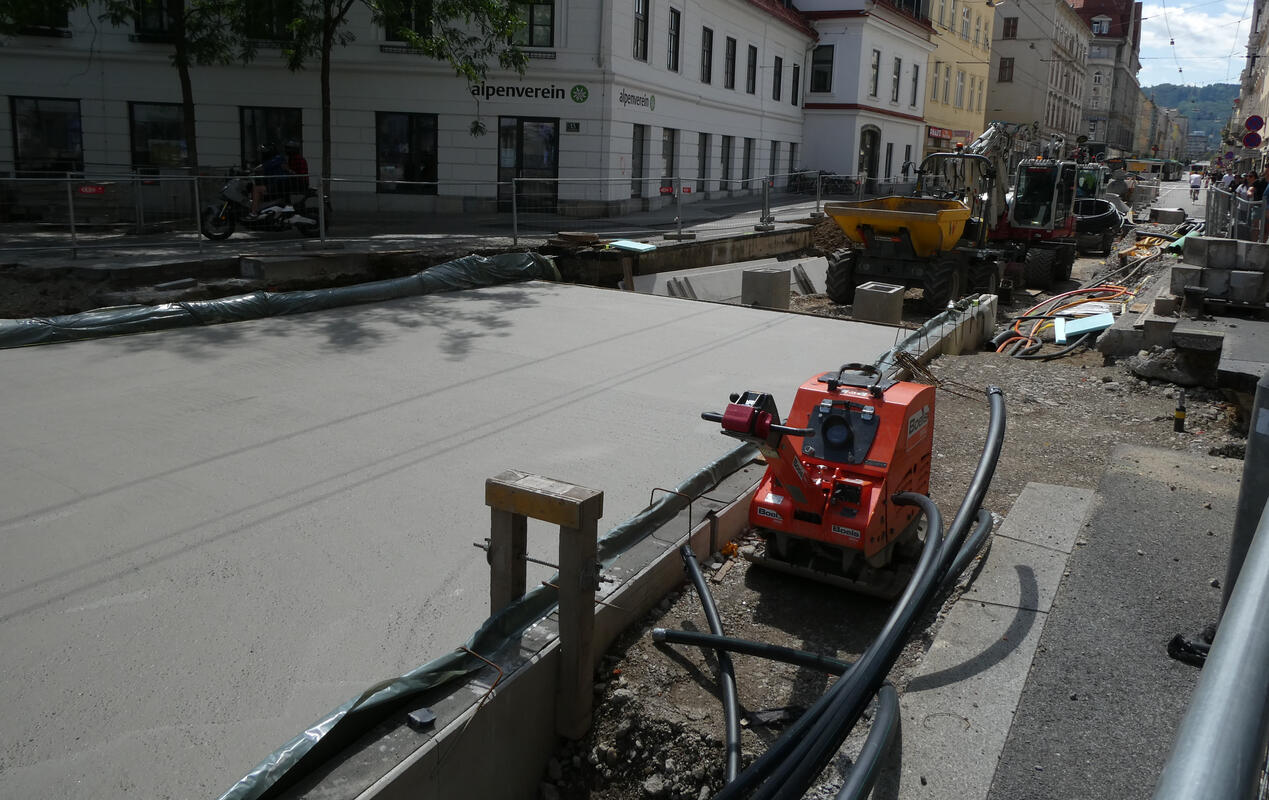 A sign stenciled onto the street, and the current status of the streetcar construction at Annenstraße and Vorbeckgasse.