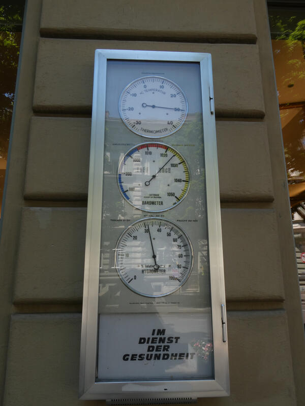 This pharmacy had a weather display of temperature, barometric pressure, and relative humidity. The caption says “In service to your health”