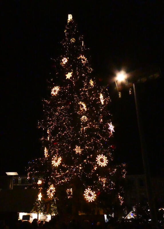 They turned on the lights on the big Christmas tree at Hauptplatz today. I was up on Schloßberg when it happened, so I was able to get some photos.