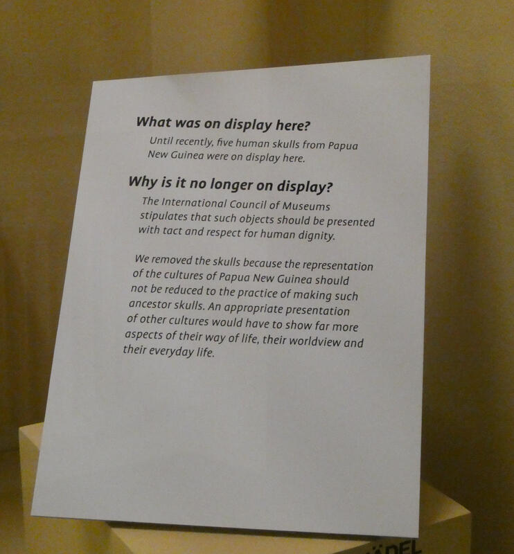 This exhibit of human skulls was removed “because the representation of the cultures of Papua New Guina should not be reduced to the practice of making such ancestor skulls. An appropriate presentation of other cultures would have to show far more aspects of their way of life, their worldview and their everyday life.”