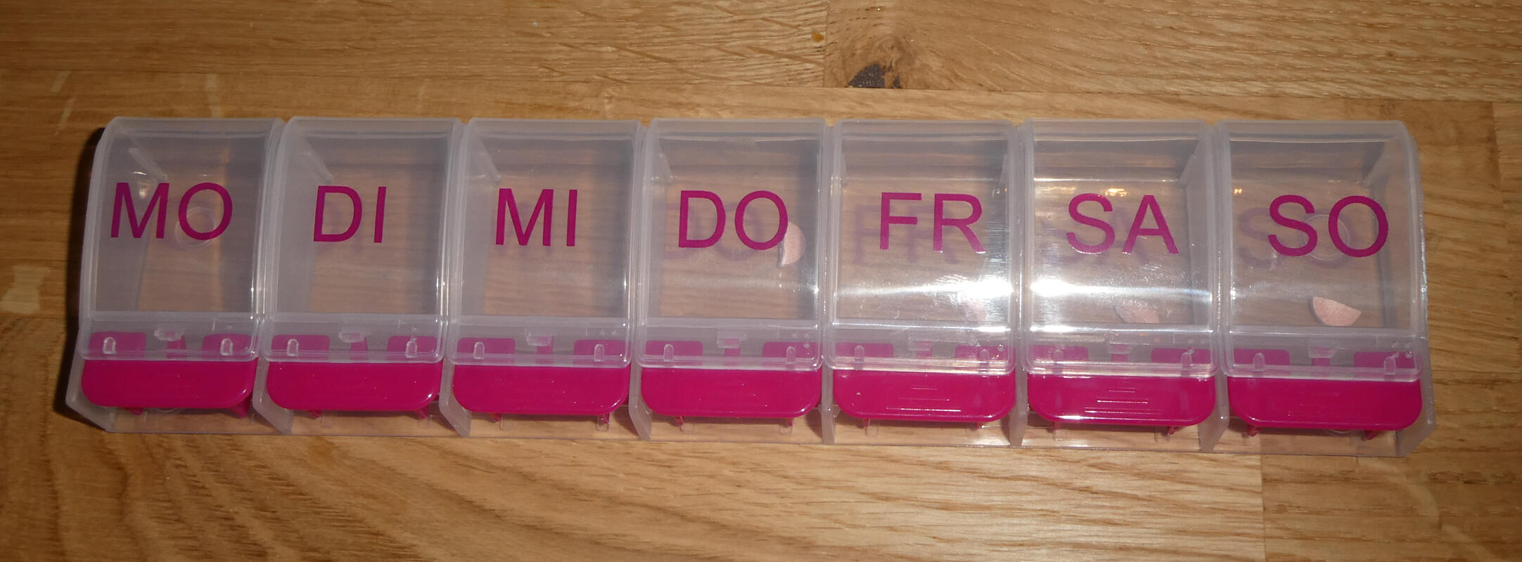 I bought a daily pill box. (Taking the pill is so automatic that I sometimes forget if I have taken it or not.) Notice that the week begins with Monday, as is the standard in Europe.
