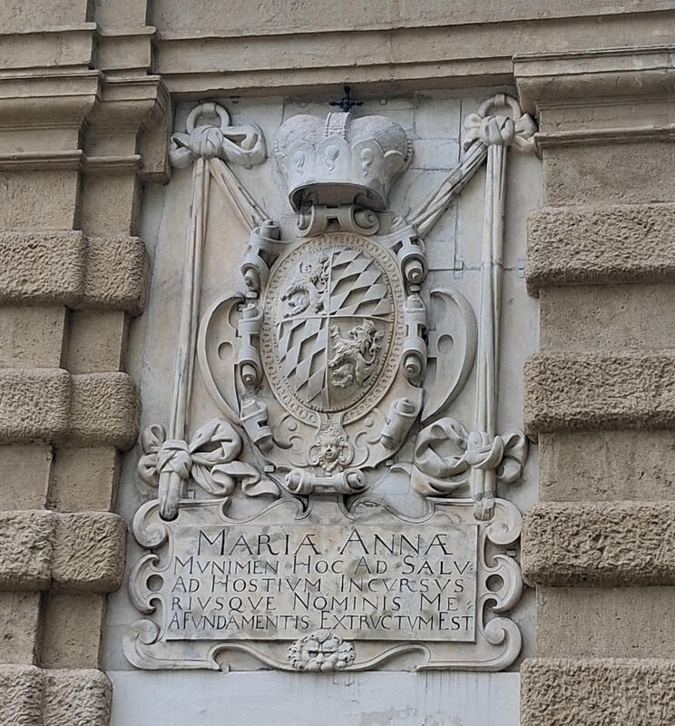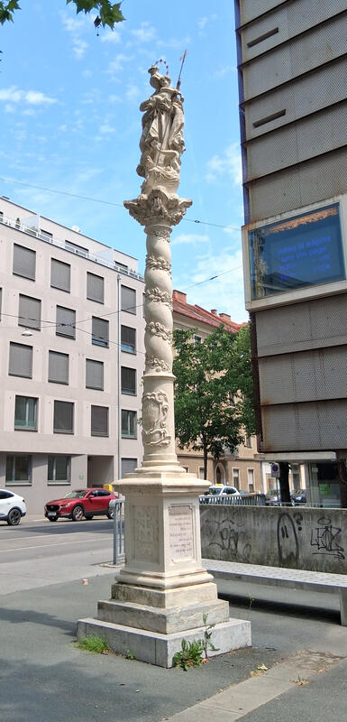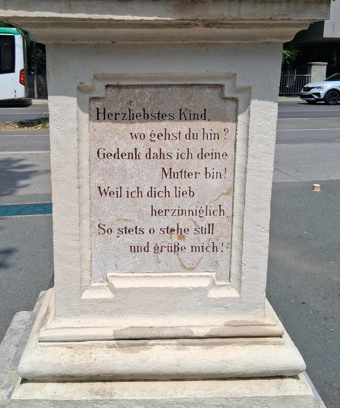 There are lots of statues of Mary and baby Jesus here in Graz. Herewith a picture of one of them, plus the inscriptions at the base.