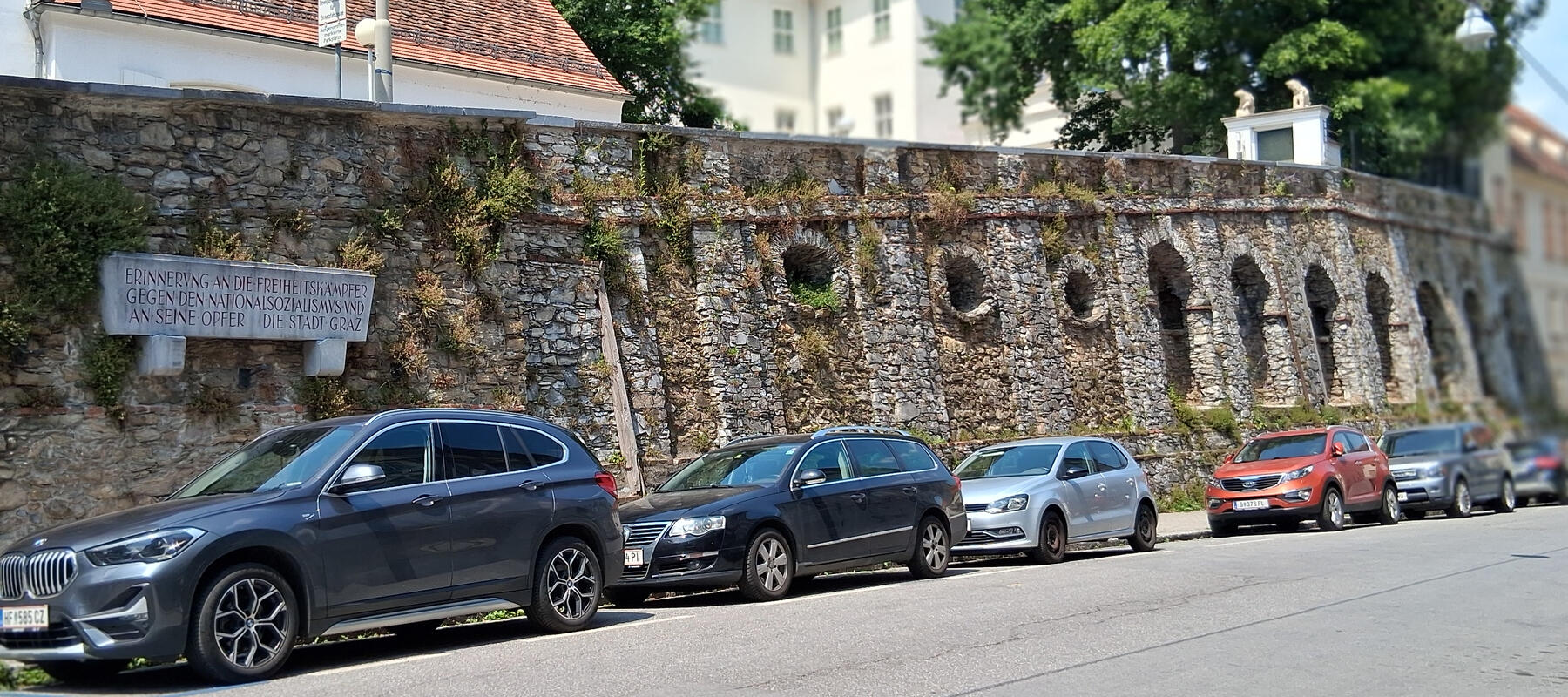 The sign at the left reads “In remembrance of the freedom fighters against and the victims of National socialism. The city of Graz.”