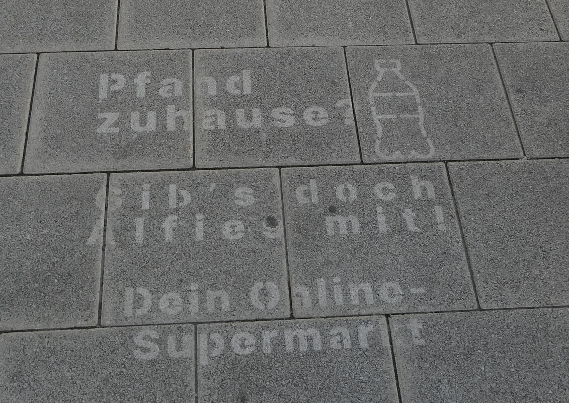 A sign stenciled onto the street, and the current status of the streetcar construction at Annenstraße and Vorbeckgasse.