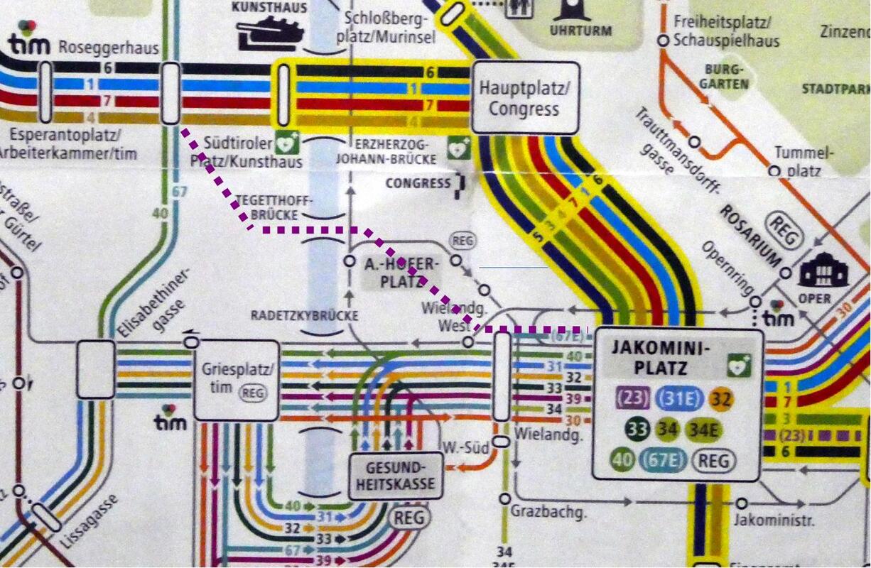 Continuing the topic from yesterday about the transit system: the new lines (16 and 17) on Vorbeckgasse are going to follow the purple dotted line in the following graphic (as closely as I could render it, that is.) When I looked at the current transit map, my first thought was, “I would sure hate to be the person who has to re-draw the map to make everything fit.”