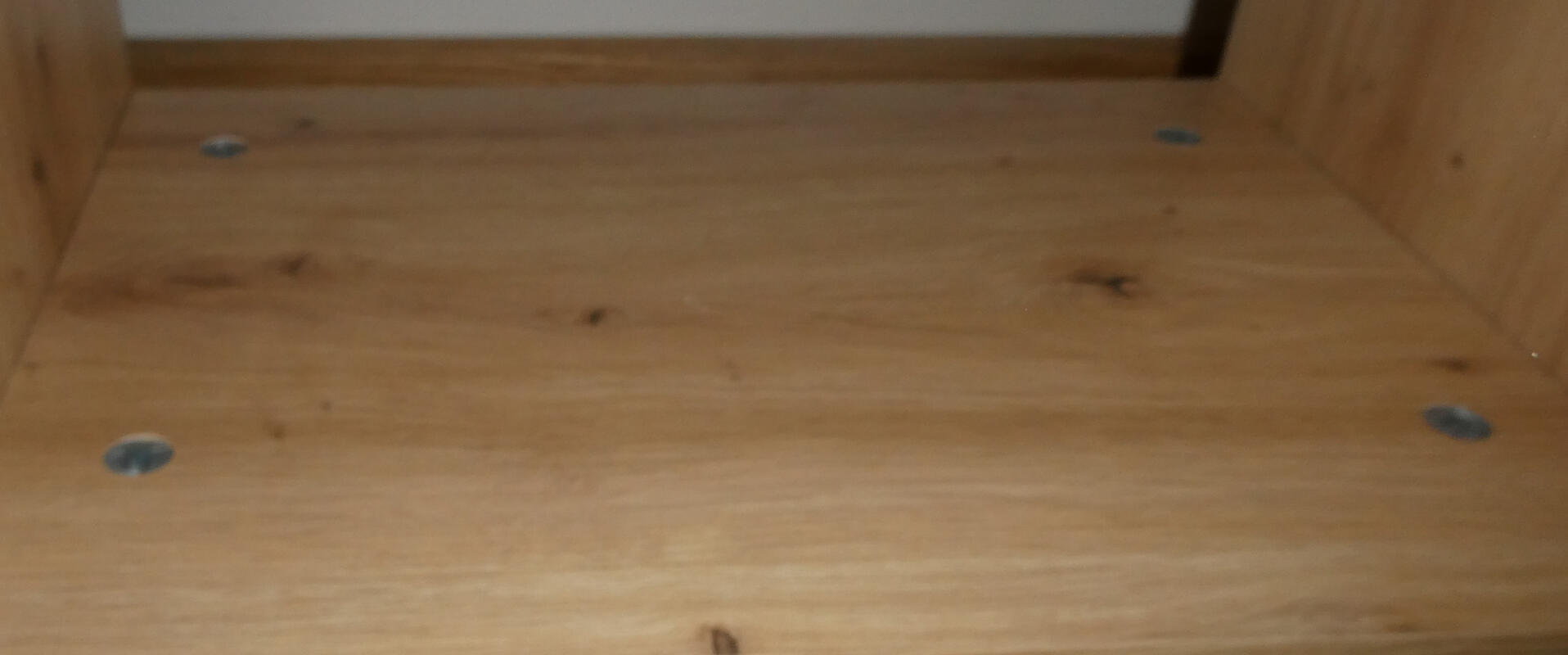 I noticed that there’s still one mistake. The screws that you see in this picture shouldn’t be visible. I put the panel in upside-down. I could fix it, but I’d have to take apart the main body of the nightstand. There’s a part of me telling me to do it right; there’s another part telling me to leave well enough alone.