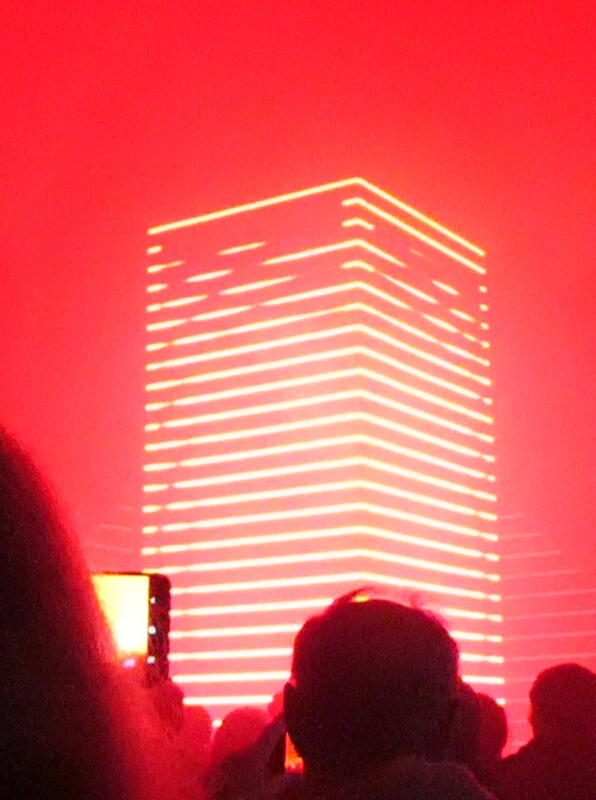 „Flux“ (#13): This was the absolute highlight for me. The rods rotate and change color in time to the music. If you look at the second video, you will see that they move really fast. I was thinking, “I sure hope they tested this so that the rods don’t fly off into the crowd.”