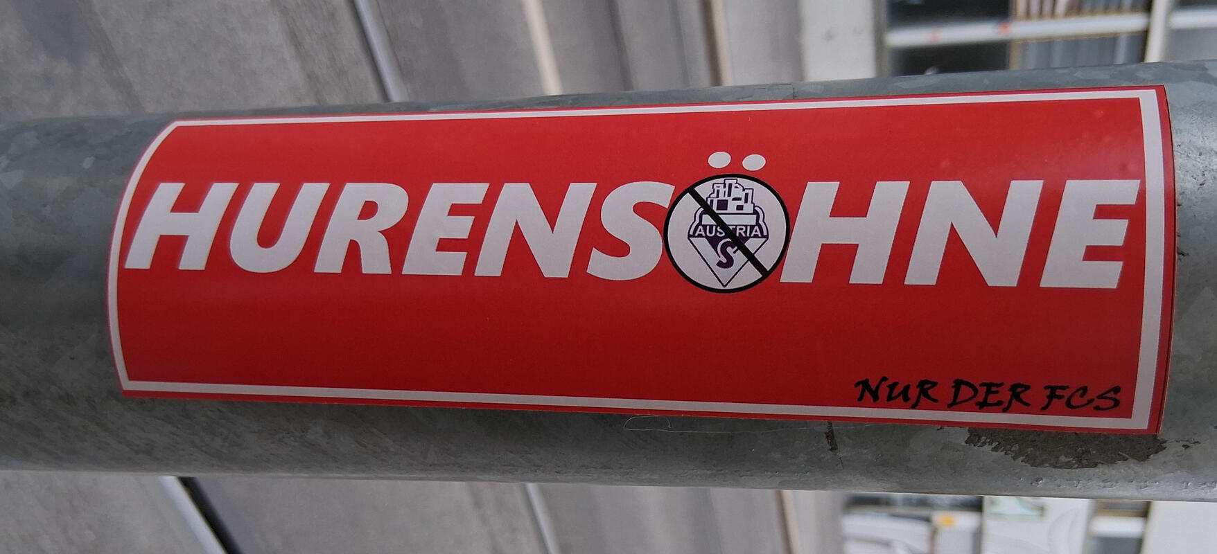 This sticker has (I think) something to do with a rivalry between soccer teams in Graz. The word „Hurensöhne“ is a fairly heavy insult; it means “sons of bitches”.