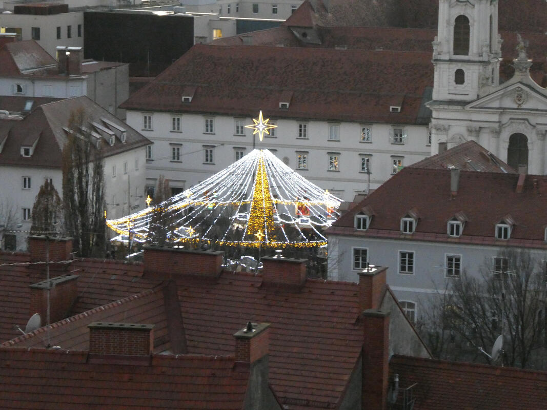 They turned on the lights on the big Christmas tree at Hauptplatz today. I was up on Schloßberg when it happened, so I was able to get some photos.