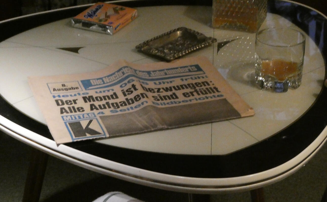 This detail of a diorama of people watching the moon landing has a bottle of whiskey on the table (partially shown) and Manner Schnitten, a very popular cookie from Austria. Note the ashtray, which is something of a rarity nowadays, at least in the US.